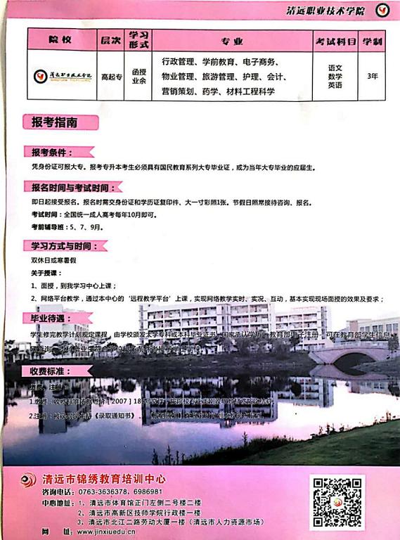 共青團清遠市委員會2017年圓夢計劃正式啟動!【北京大學圓夢計劃,圓你大學夢】成人本科:北京大學(網(wǎng)絡(luò)教育)符合條件者3年共交學費2000元,專科:清遠職業(yè)技術(shù)學院(成人函授),符合條件者3年共交學費1000元,就能完成學業(yè),輕松拿證!另外,企業(yè)人力資源管理師職業(yè)資格考證、叉車上崗證考證等現(xiàn)火熱接受報名中,歡迎有志提升自己的朋友咨詢報名。咨詢熱線:成老師0763-3630112  15816286696微信同步 報名地址:清遠市北江二路勞動大廈一樓