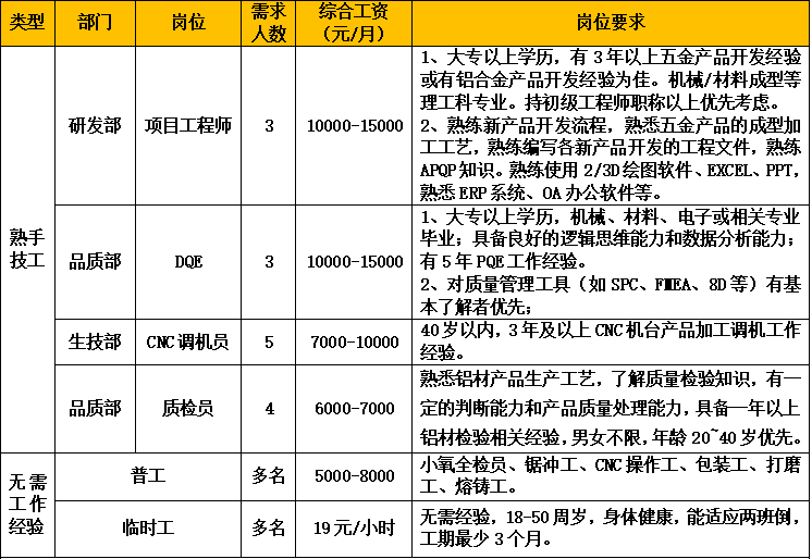 公司擁有廣東省唯一的鋁車體工程技術(shù)研究中心。“鈦美鋁材”品牌先后獲得鋁型材行業(yè)內(nèi)的最高榮譽(yù):“中國馳名商標(biāo)”、“中國著名品牌”、“中國名優(yōu)產(chǎn)品”;公司榮獲“國家高新技術(shù)企業(yè)”、廣東省“專精特新”企業(yè)等榮譽(yù)稱號。因生產(chǎn)發(fā)展需要,誠聘以下崗位: